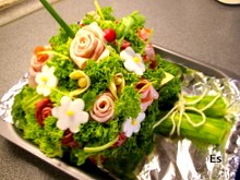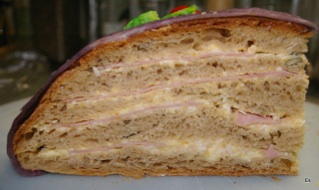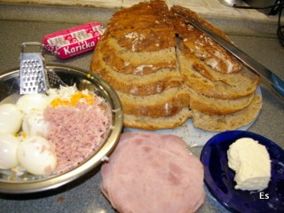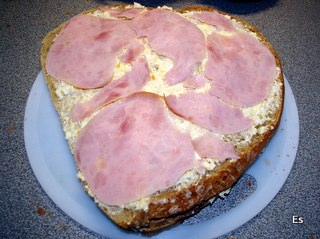 medzi krajce s pomazánkou dáme plátky šunky, spojíme do požadovaného tvaru, potrieme ešte zvyšnou pomazánkou.