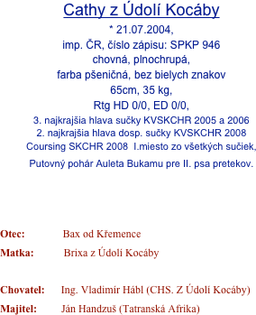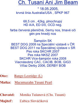Jim je potomok australských a amerických predkov, má ideálnu výšku, silnú kostru, výborné uhlenie predných aj zadných končatín, krásnu hlavu a je potomkom hnedonosého psa, čo by malo priniesť peknú, vyrovnanú farbu pre šteniatka. Je zdravý, priateľský a nekonfliktný. Veríme, že aj náš tretí vrh sa vydarí a šteniatka od nás budú robiť svojim novým majiteľom len radosť.