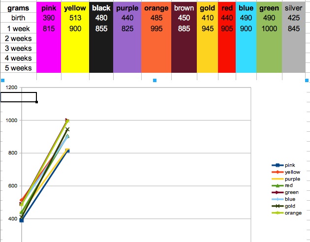 Pôrodné hmotnosti šteniatok boli od 390 do 513 g.