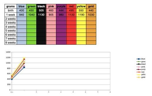 Pôrodné hmotnosti šteniatok boli od 400 do 550 g.