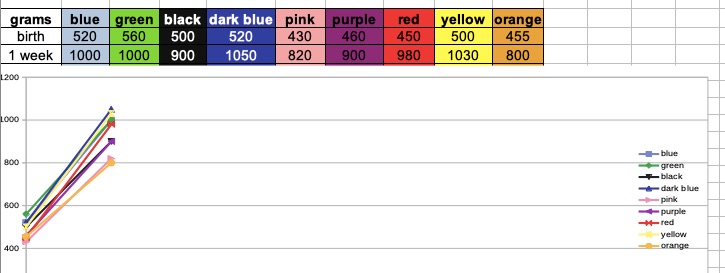 Pôrodné hmotnosti šteniatok boli od 430 do 560 g.