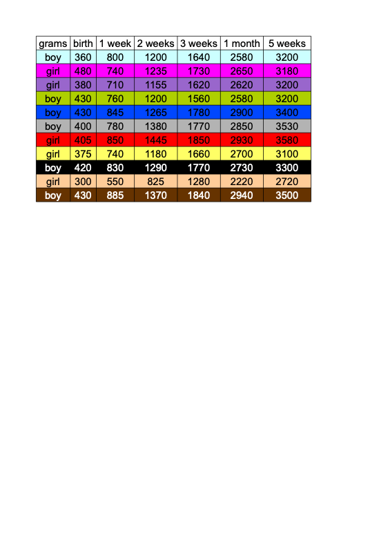 Pôrodné hmotnosti boli od 300 do 480 g.